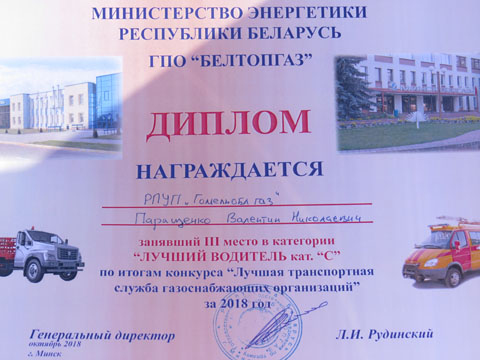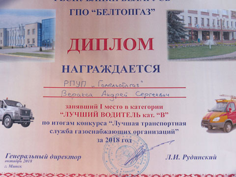 РПУП «Гомельоблгаз» представляла команда филиала ПУ «Жлобингаз» в составе начальника СЭАТ Устиновича С.Н. и водителей Вераксы А. С. и Паращенко В.Н. занявшая первое место в областном конкурсе. В напряженной и упорной борьбе, благодаря своим знаниям и профессиональным навыкам полученным в результате упорной подготовки наша команда заняла второе место среди команд газоснабжающих организаций республики. Кроме этого в личном зачете заняли призовые места: Веракса Андрей Сергеевич – I место в категории «Лучший водитель категории «В»; Паращенко Валентин Николаевич – III место в категории «Лучший водитель категории «С».