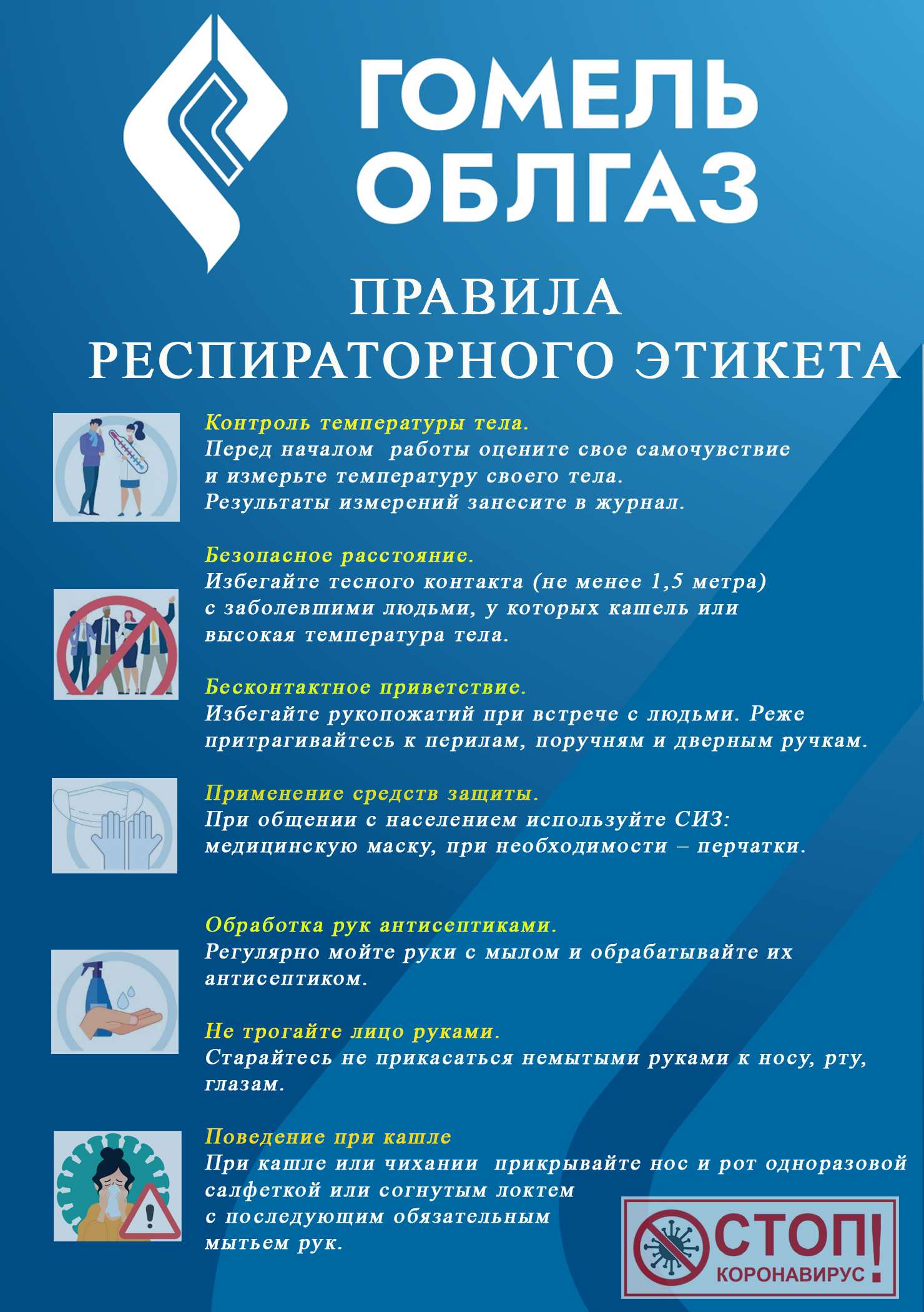 В целях предупреждения распространения коронавирусного заболевания типа COVID-19 специалисты предприятия разработали памятку «Правила респираторного этикета», которая будет размещена во всех кабинетах структурных подразделений, на информационных стендах и уголках по охране труда.