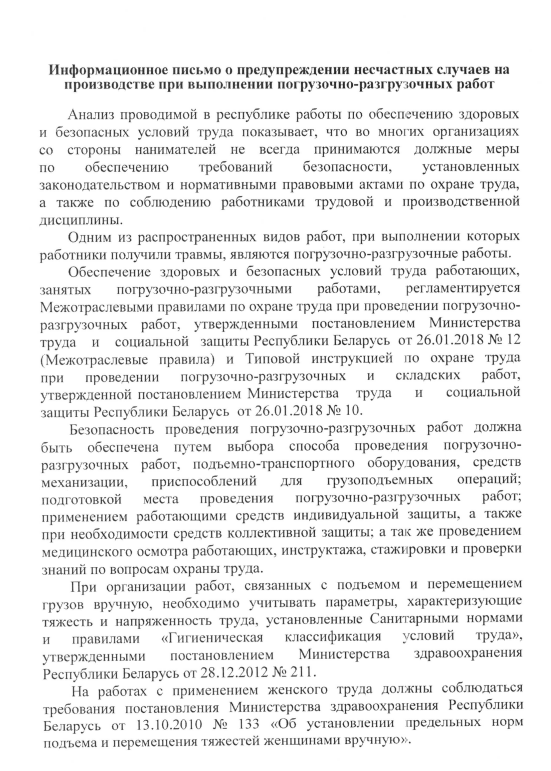 В целях профилактики производственного травматизма Департамент государственной инспекции труда Министерства труда и социальной защиты Республики Беларусь подготовил информационное письмо о предупреждении несчастных случаев на производстве при проведении погрузочно-разгрузочных работ.